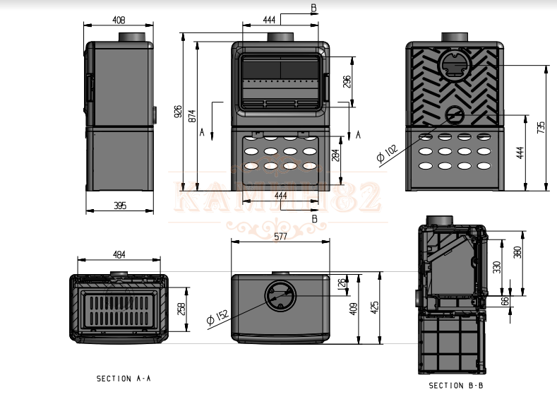 Бренд FireBird (Россия) Страна Россия; Китай Ширина 577 Высота 874 Глубина 409 Диаметр дымохода 150 Мощность, кВт 9 Присоединение дымохода верхнее/заднее Материал чугун Топливо дрова - Оплата и доставка